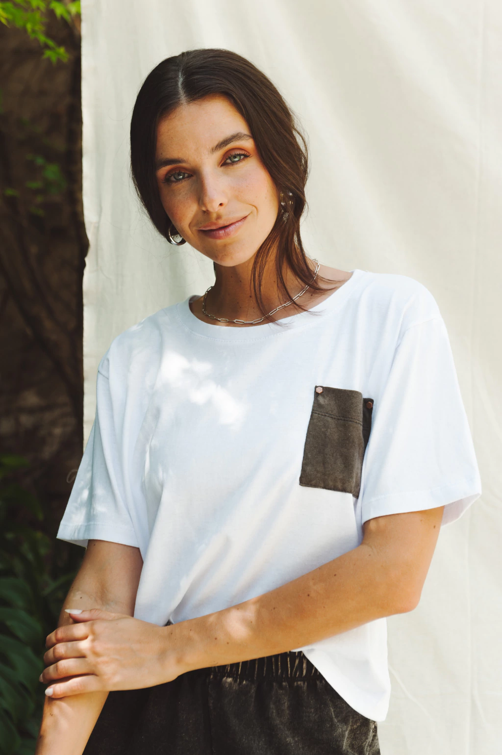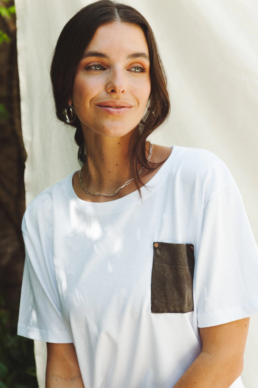 Una Remera Básica pero con estilo propio. Distinta a cualquier otra Básica con sus detalles diferenciados. Tiene un bolsillo con un proceso de gastado con unas tachitas que le dan un toque distinto.