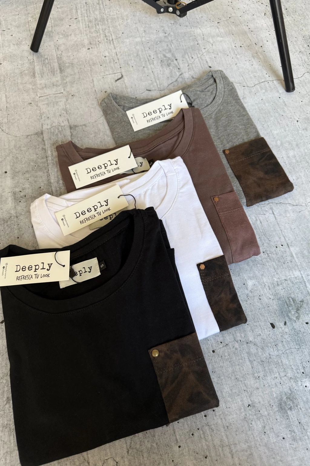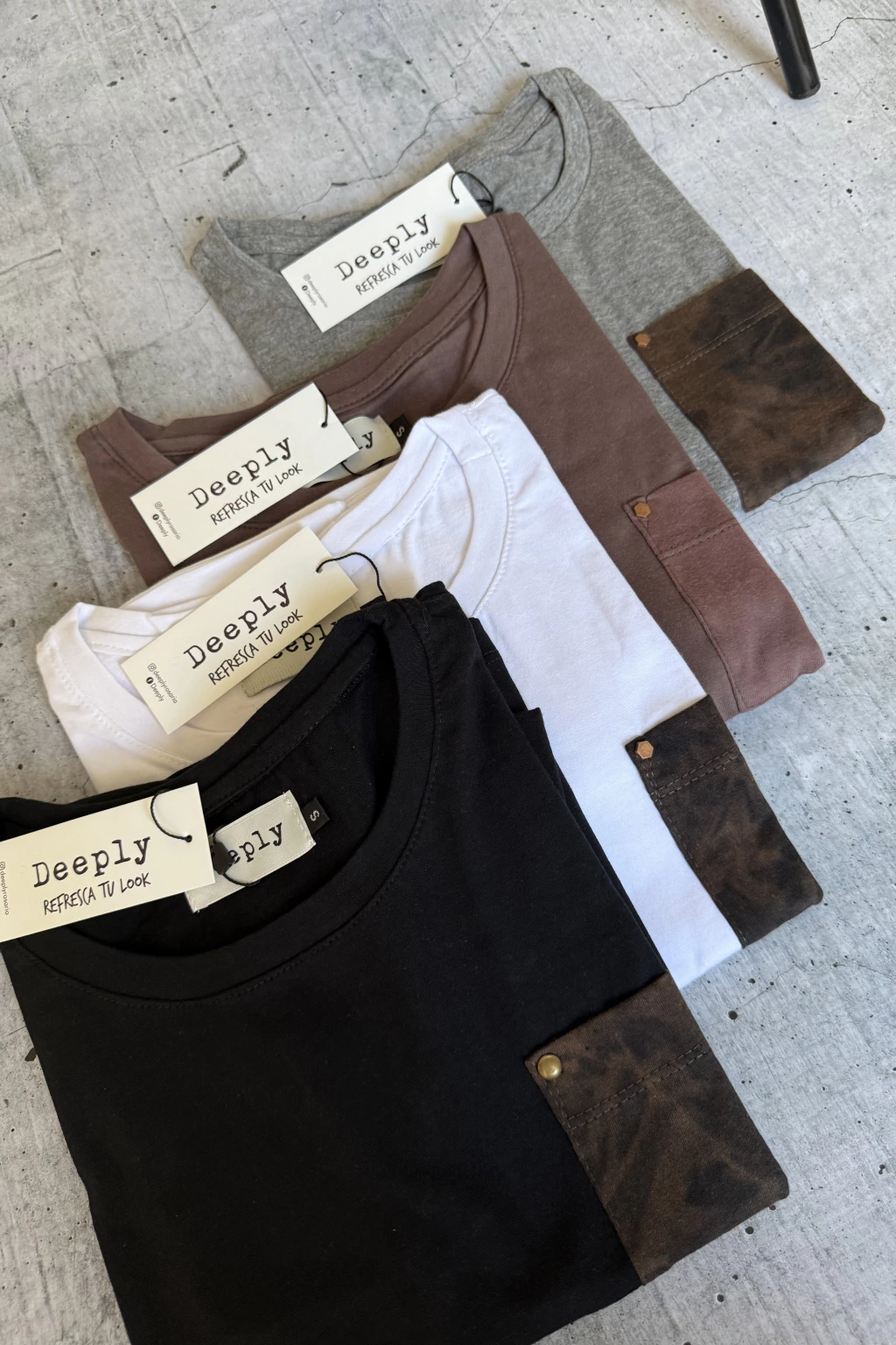 Colores: Negro con bolsillo negro gastado, Blanco con bolsillo negro, Choco con bolsillo choco gastado, Gris Melangecon bolsiilo negro gastado.